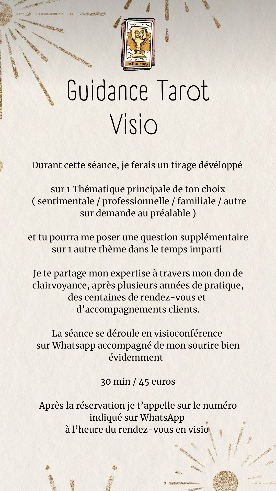 Je réalise des guidances tarot personnalisées pour des thèmes comme tirage tarot amour, tirage tarot travail, tirage tarot avenir ou lecture tarot approfondie, accessibles en ligne ou par écrit pour répondre à vos besoins avec précision et clarté.